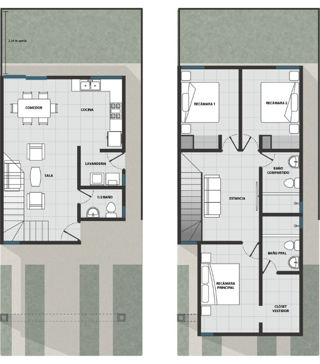 El modelo Nisa ofrece 104.54 m² de construcción, planta baja con sala, comedor, cocina, lavandería y medio baño, y planta alta con recámara principal con vestidor y clóset, más dos recámaras adicionales y un baño compartido. Una opción ideal para familias primerizas que buscan funcionalidad y diseño moderno en Chihuahua.