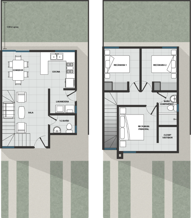 Con 137.99 m² de construcción, el modelo Álvar amplía el espacio familiar con una distribución en dos niveles que incluye sala, comedor, cocina, lavandería, medio baño en planta baja, y tres recámaras — incluyendo recámara principal con baño privado, vestidor y clóset — en planta alta.